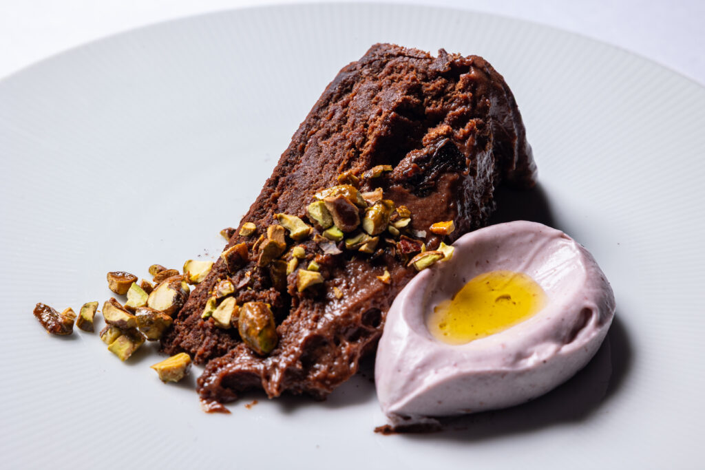 Sauterne cherries, cassis cream, candied pistachios
